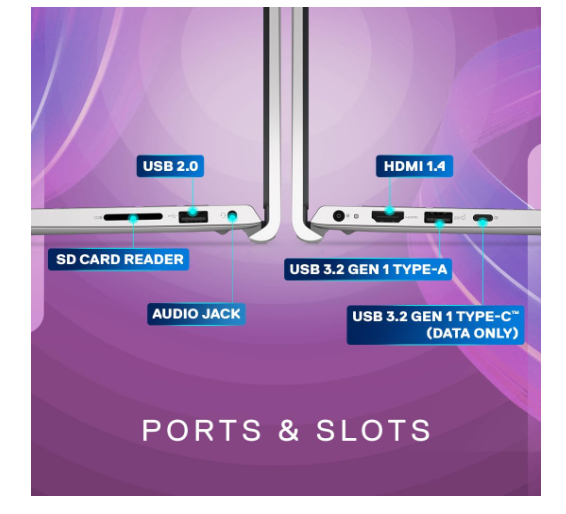 - Ports: 1 USB 3.2 Gen 1 Type-A port + 1 USB 3.2 Gen 1 Type-C data only, 1 USB 2.0 port, 1 headset jack, 1 HDMI 1.4 port*, 1 M.2 2230/2280 slot for solid-state drive, 1 SD 3.0 card slot.
