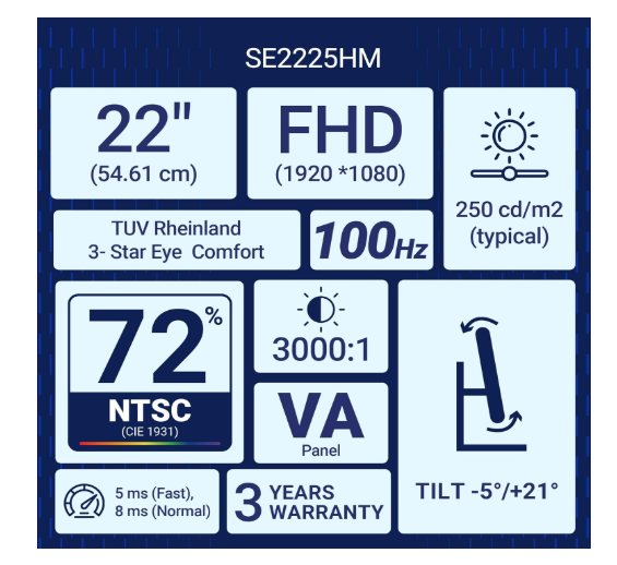 Dell SE2225HM 21.5"/54.6cm FHD, 100Hz Refresh, VA Panel, 5ms Response, Tilt Adjust, 3000:1 Contrast, 250 cd/m2, Ports: HDMI, DP 1.2, VGA, TÜV Rheinland 3-Star Eye Comfort, Ultra-Thin bezels Monitor