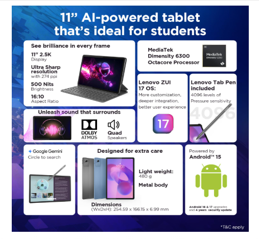 Lenovo Idea Tab Smartchoice | Wi-Fi + 5G |11" Display, 2.5K Resolution, 90Hz Refresh|8GB RAM, 256GB ROM| MediaTek Dimensity 6300| 7040mAh|4 Speakers| USB-C| Luna Grey